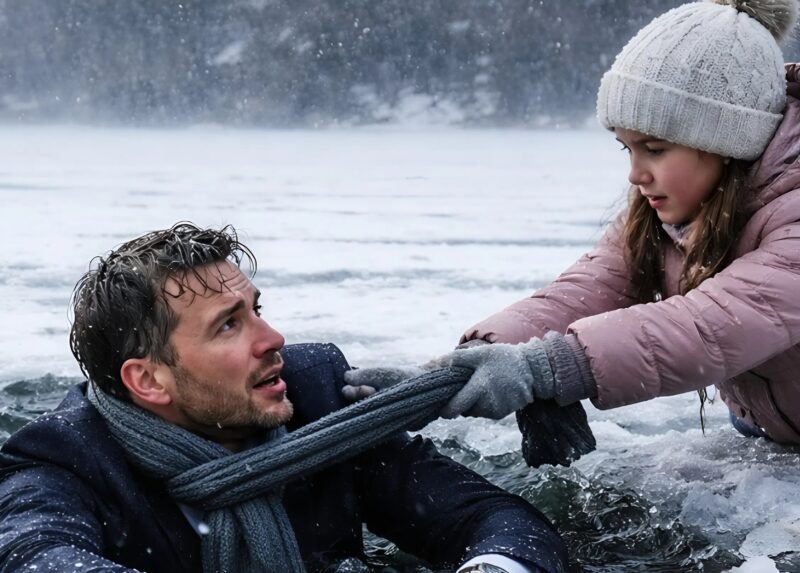 A man in an expensive coat fell through the ice while everyone else walked past. Only a seven-year-old girl dared to help: she lay down on the ice and began pulling on his scarf — and just a minute later, something happened that left everyone around frozen… 😱😲