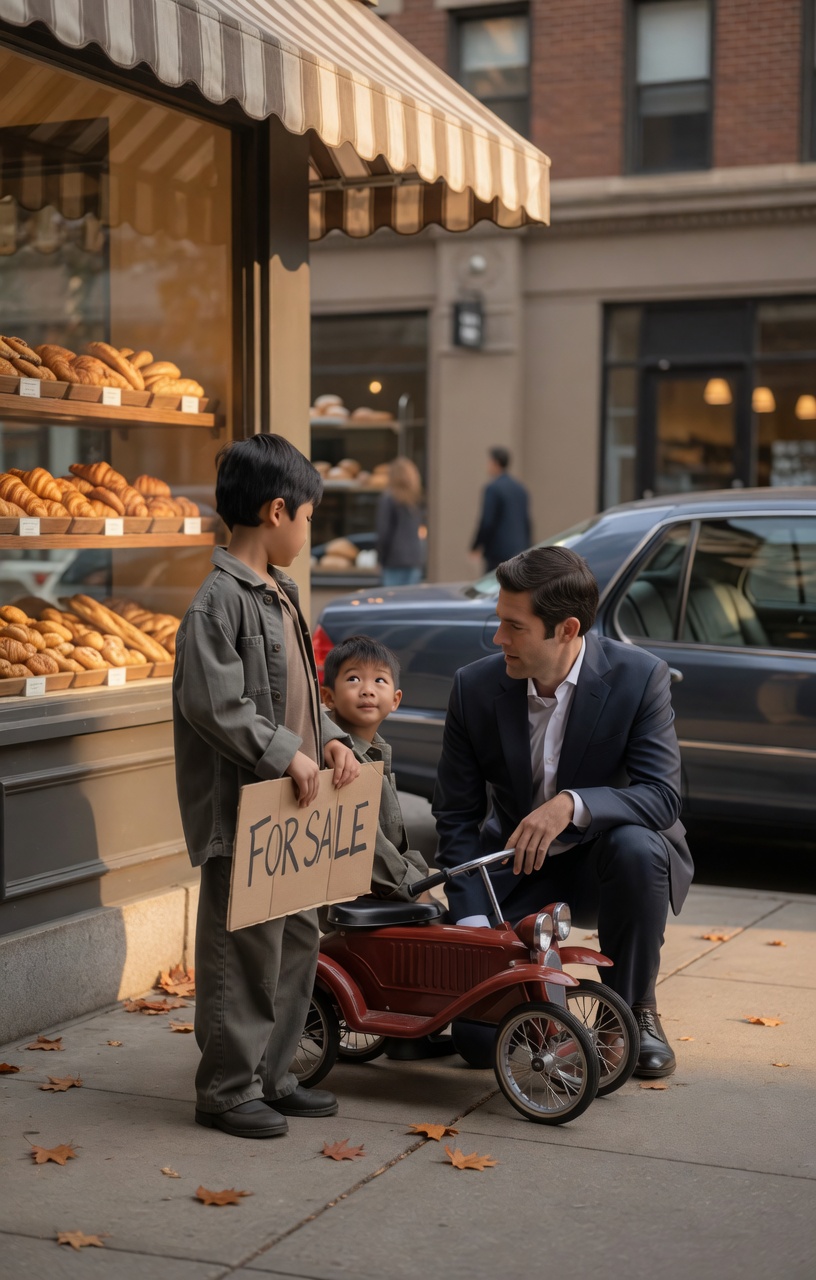 The boy was selling the only thing his dead father ever gave him. On a cold autumn sidewalk outside a bakery glowing with warm bread and soft yellow light, two small brothers stood beside a red pedal car that looked far too loved to be for sale. The older one, Ethan Brooks, tried to stand straight, holding a cardboard sign with both hands like he was trying to be older than he really was. FOR SALE.