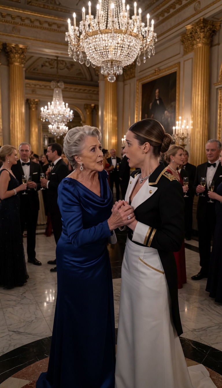 A refined elderly woman named Margaret Whitmore stood beneath the golden chandeliers of the ballroom, dressed in a sapphire gown that reflected decades of wealth, power, and control, holding a champagne glass with effortless elegance, smiling politely as conversations flowed around her, but then something shifted, something small yet impossible to ignore, her eyes caught movement as a young waitress passed by, dressed in a black and white uniform, quiet, graceful, almost invisible in a room built for people like Margaret, and then she saw it.